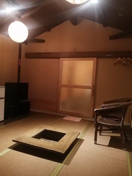 中央には囲炉裏風のテーブルがあり、古民家風の雰囲気あるお部屋